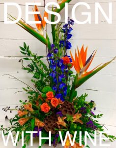 Join us for another evening of Fun, Creativity, and Wine! 🍷 In this “Design with Wine” and Fresh Flowers Class you will learn to make and take home this “Sunrise and Sapphire” Contemporary Arrangement! The arrangement will contain Gorgeous Birds of Paradise, Deep Blue Delphinium,